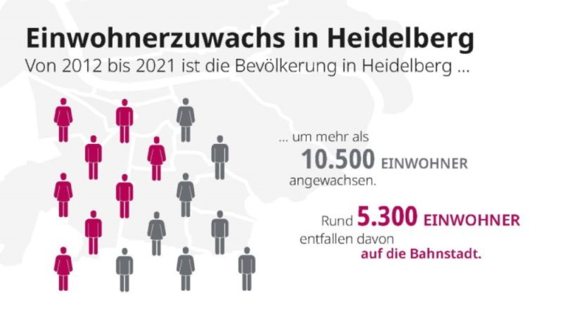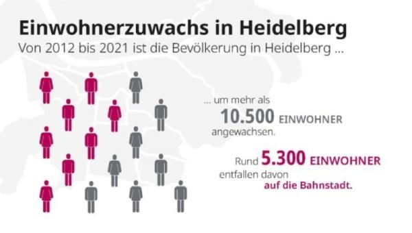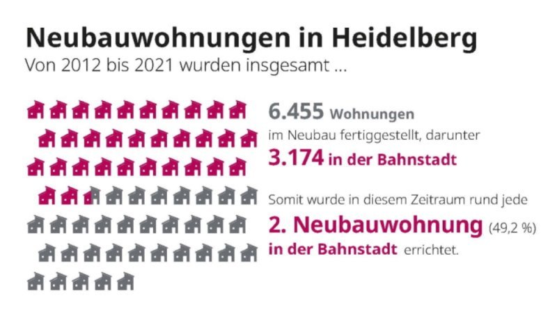 Die Bahnstadt ist der Wohnungslieferant für Heidelberg: Sie ist der Stadtteil, in dem seit 2012 am meisten Wohnraum geschaffen wurde – und das komplett in energieeffizienter Passivhaus-Bauweise. Von insgesamt 6.455 Wohnungen im Neubau, die seit 2012 in Heidelberg entstanden, befinden sich 3.174 Wohnungen im neuen Stadtteil. Damit wurde jede zweite Neubauwohnung Heidelbergs in der Bahnstadt gebaut. Die hohe Zahl an neuem Wohnraum schlägt sich in der Bevölkerungsentwicklung nieder: Seit 2012 hat jede zweite Neubürgerin und jeder zweite Neubürger Heidelbergs den neuen Lebensmittelpunkt in der Bahnstadt. Dabei ist jede Dritte und jeder Dritte aus anderen Stadtteilen Heidelbergs zugezogen. Somit konnten diese Familien in der Stadt gehalten werden und zogen nicht ins Umland.