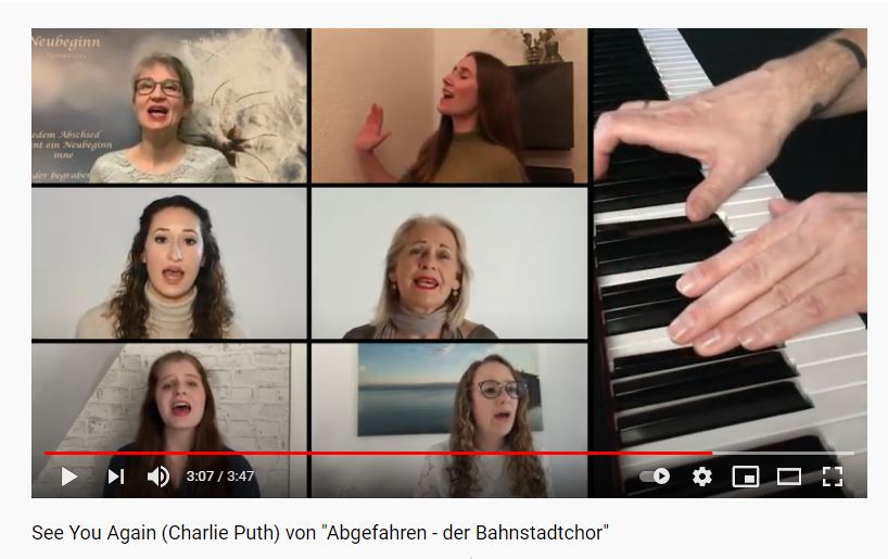 Jeder singt für sich allein und dank der heutigen Technik wird daraus ein vielstimmiger Chor, was geradezu ein Abbild der Corona-Pandemie ist. Der Bahnstadtchor „Abgefahren“ hat es sich nicht nehmen lassen, aufgrund des Präsenzverbots kreativ zu werden – und das Ergebnis für alle sichtbar und hörbar auf Youtube zu stellen. Das Video kann auf dem Kanal „Abgefahren – der Bahnstadtchor“ auf www.youtube.de angeschaut werden.