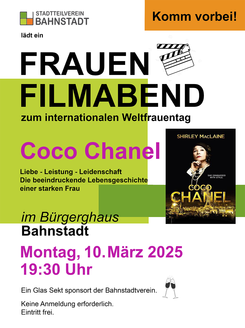 Anlässlich des internationalen Weltfrauentages lädt der Stadtteilverein Bahnstadt zum Frauenfilmabend ein. „Coco Chanel“ läuft am Montag, 10. März, um 19:30 Uhr im Bürgerhaus Bahnstadt. Der Film porträtiert die beeindruckende Lebensgeschichte einer starken Frau, die immer an sich, ihre Träume und Ziele geglaubt und dafür gekämpft hat. Der Eintritt ist frei. Ein Glas Sekt sponsort der Bahnstadtverein.