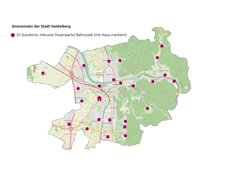 Im Auftrag der Stadt Heidelberg errichtet eine Fachfirma derzeit im Stadtgebiet ein neues Sirenennetz. Die Arbeiten laufen auf Hochtouren: Seit dem Start im März 2023 sind bereits 16 von insgesamt 25 Sirenen in Heidelberg installiert worden. Die übrigen neun Standorte sollen bis Ende August folgen. Im Anschluss ist der Einbau der Funktechnik in die Sirenen und die Installation des zentralen Überwachungssystems in der Feuerwache am Baumschulenweg vorgesehen. Nach der technischen Abnahme der gesamten Anlage kann das neue Sirenennetz voraussichtlich im Spätherbst getestet werden. Die Stadt wird die Bevölkerung frühzeitig über den Termin informieren. Die Inbetriebnahme des Sirenennetzes ist Ende 2023 geplant.