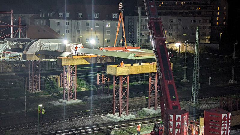 Gneisenaubrücke: Erstes Brückenelement über Bahngleisen bei Nachtschicht eingehoben
